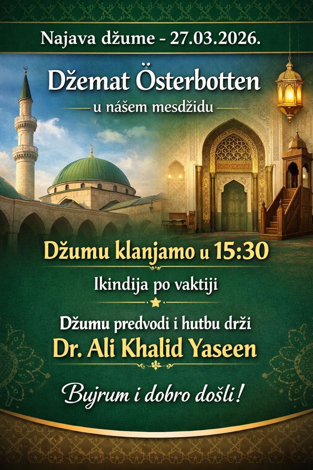 Sa velikim zadovoljstvom najavljujemo džuma-namaz koji će se održati u petak, 27. marta 2026. godine, u našem mesdžidu u okviru Džemata Österbotten.